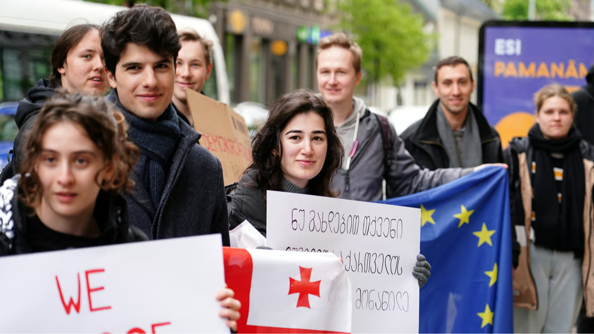 Акция протеста против закона «об иностранных агентах» у посольства Грузии в Риге, Латвия, 9 мая 2024 года. Фото: LETA