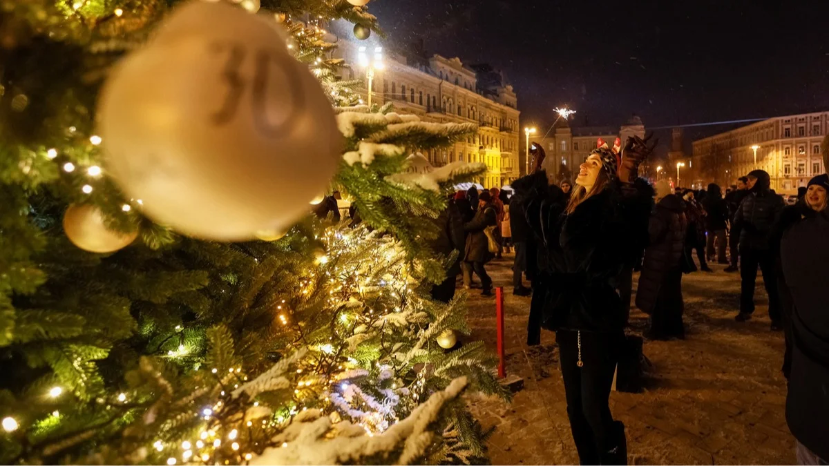 Люди собираются у новогодней ёлки, чтобы отпраздновать наступление Нового года перед введением комендантского часа на Софийской площади в Киеве, Украина, 31 декабря 2025 года. Фото: Gleb Garanich / Reuters / Scanpix / LETA